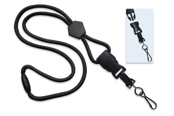 2135-4501 Black Round Lanyard W/ Breakaway, Diamond Slider & Dtach Swivel Hook. Swivel Hook Detaches To Allow For Easy Access. 1/4″ (6 mm) Round; 36″ (914 mm) Cut Length Prior To Assembly. Comes W/ A Diamond Slider That Has A 3/4″ (19 mm) Imprint Area. Minimum Order 100 Pieces.
